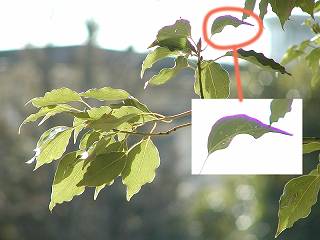 →はf3.5,1/125秒,70mm(380mm)で撮影したものである。ごらんの通り色収差がかなり目立つ。絞り込むと軽減されるんじゃないかと思っているのだが試したことはないので不明。 特にハイコントラストシーンの望遠時の周辺部で発生しやすいようで、逆光気味の時は要注意である。 ちなみに、見た目の雰囲気的になんとなく「苦手そうに見える」ワイド側の画質は比較的良好である。 |